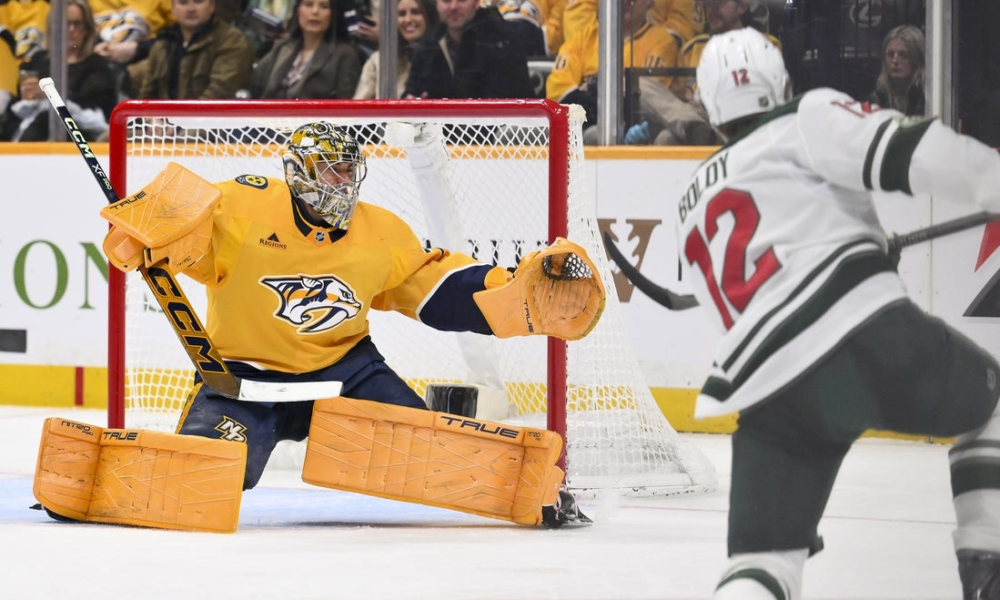 Feb 4, 2026; Nashville, Tennessee, USA; Nashville Predators goaltender Juuse Saros (74) blocks the shot of Minnesota Wild left wing Matt Boldy (12) during the second...