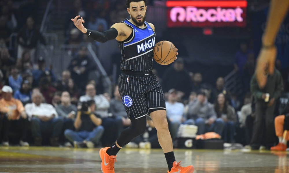 Jan 26, 2026; Cleveland, Ohio, USA; Orlando Magic guard Tyus Jones (2) brings the ball up court in the first quarter against the Cleveland Cavaliers at...