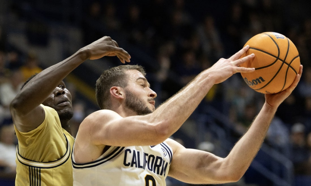 Feb 4, 2026; Berkeley, California, USA; California Golden Bears center Milos Ilic (8) rebounds in front of Georgia Tech Yellow Jackets forward Baye Ndongo (11) during...