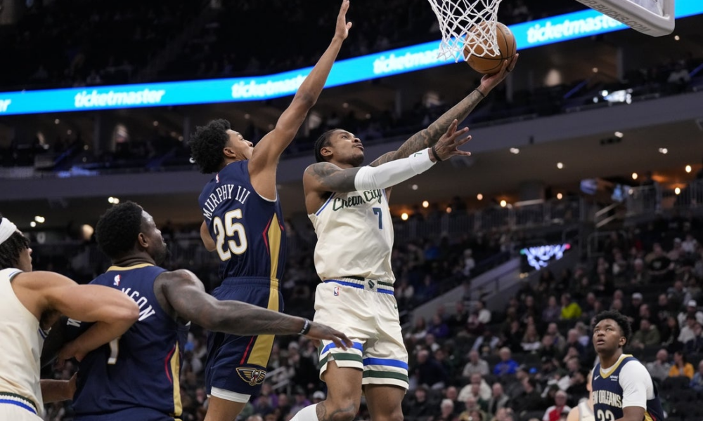 Feb 4, 2026; Milwaukee, Wisconsin, USA; Milwaukee Bucks guard Kevin Porter Jr. (7) shoots in against New Orleans Pelicans forward Trey Murphy III (25) during the...