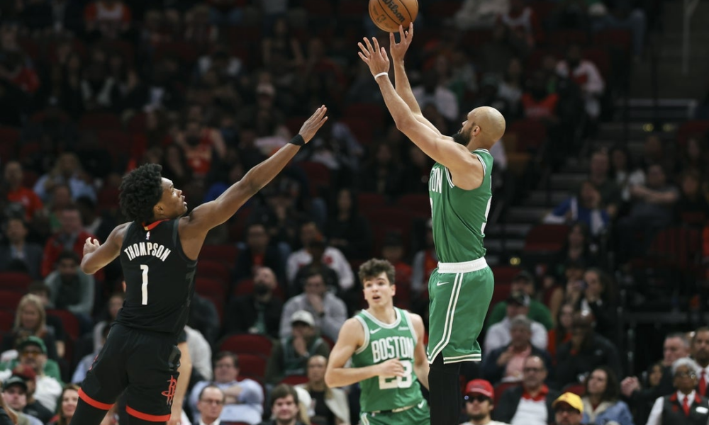 Feb 4, 2026; Houston, Texas, USA; Boston Celtics guard Derrick White (9) shoots the ball as Houston Rockets guard Amen Thompson (1) defends during the second...