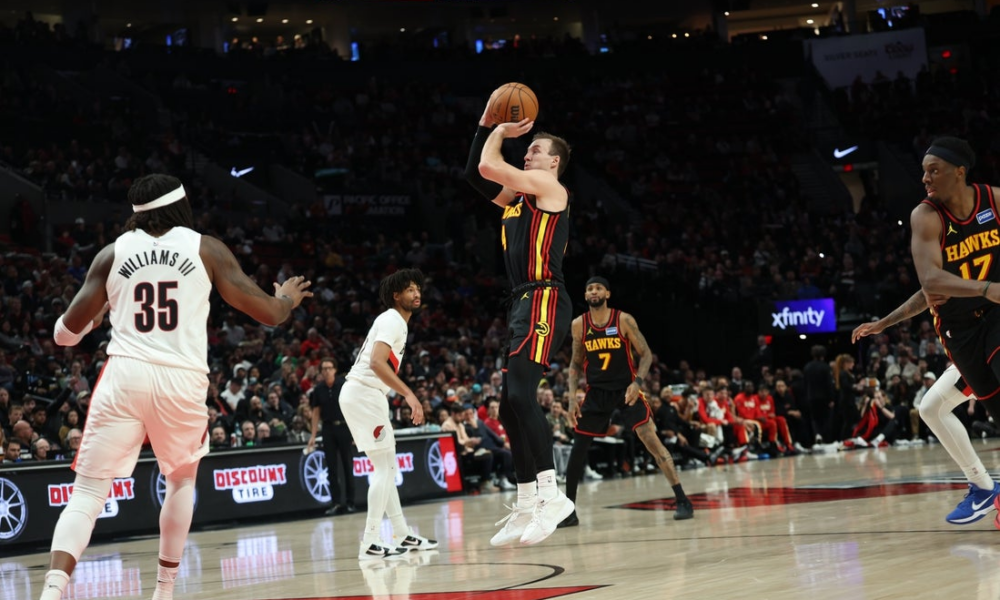 Jan 15, 2026; Portland, Oregon, USA; Atlanta Hawks guard/forward Luke Kennard (4) shoots the ball over Portland Trail Blazers center/forward Robert Williams III (35) during the...