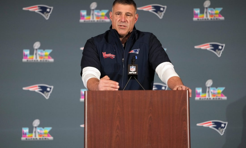 Feb 5, 2026; Santa Clara, CA, USA; New England Patriots head coach Mike Vrabel talks to media members at the Santa Clara Marriott. Mandatory Credit: Darren...