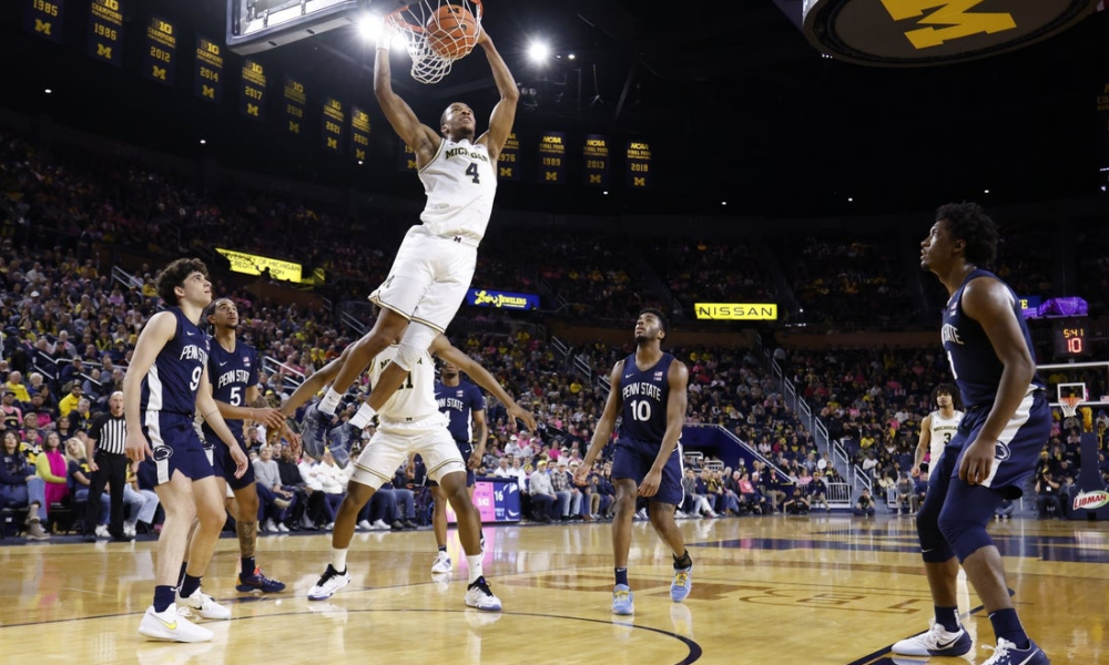 Feb 5, 2026; Ann Arbor, Michigan, USA; Michigan Wolverines guard Nimari Burnett (4) dunks in the first half against the Penn State Nittany Lions at Crisler...