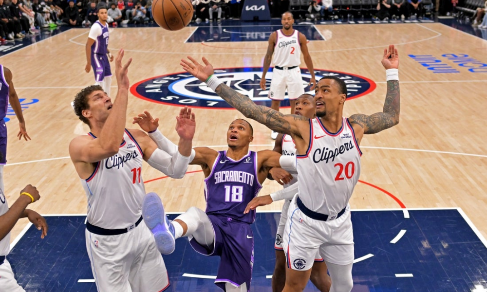 Dec 30, 2025; Inglewood, California, USA; Los Angeles Clippers center Brook Lopez (11) and forward John Collins (20) reach for a rebound after a missed shot...