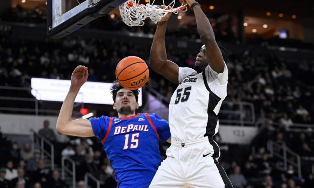 Feb 3, 2026; Chicago, Illinois, USA; DePaul Blue Demons guard Brandon MacLin (0) goes to the basket against St. John’s Red Storm forward Dillon Mitchell (1)...