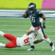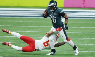 Feb 9, 2025; New Orleans, LA, USA; Philadelphia Eagles running back Saquon Barkley (26) runs the ball against Kansas City Chiefs safety Bryan Cook (6) in...