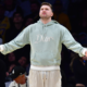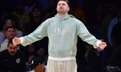 Feb 8, 2025; Los Angeles, California, USA; Los Angeles Lakers guard Luka Doncic (77) reacts watching game action against the Indiana Pacers during the second half...