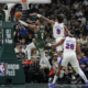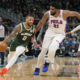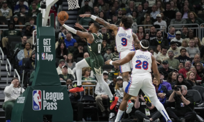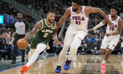 Feb 9, 2025; Milwaukee, Wisconsin, USA; Milwaukee Bucks guard Damian Lillard (0) drives for the basket against Philadelphia 76ers center Joel Embiid (21) during the third...