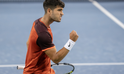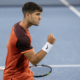 Aug 15, 2024; Cincinnati, OH, USA ; Carlos Alcaraz of Spain reacts to a point during his match against Gael Monfils of France on day four...