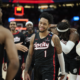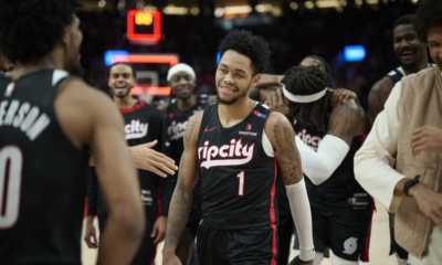 Dec 19, 2024; Portland, Oregon, USA; Portland Trail Blazers guard Anfernee Simons (1) celebrates with teammates after scoring the game winning shot against the Denver Nuggets...