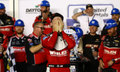 Feb 15, 2025; Daytona Beach, Florida, USA; Xfinity Series driver Jesse Love (2) reacts in victory lane after winning the United Rentals 300 at Daytona International...