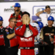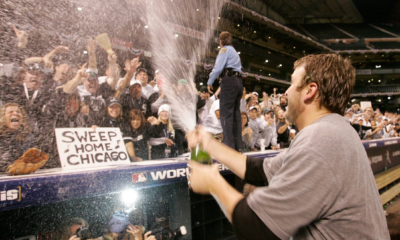 2005 World Series Game 4 — Houston Astros vs. Chicago White Sox — Mark Buehrle sprays champagne into the crowd after the White Sox World Series...