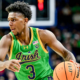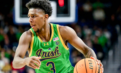 Feb 8, 2025; South Bend, Indiana, USA; Notre Dame Fighting Irish guard Markus Burton (3) dribbles in the first half against the Virginia Tech Hokies at...