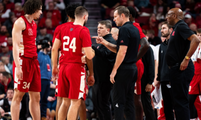 Feb 13, 2025; Lincoln, Nebraska, USA; Nebraska Cornhuskers head coach Fred Hoiberg talks to guard Rollie Worster (24) during a timeout in the first half against...