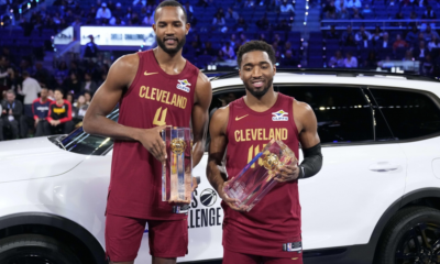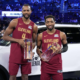 Feb 15, 2025; San Francisco, CA, USA; Team Cavs center Evan Mobley (4) and guard Donovan Mitchell (45) of the Cleveland Cavaliers celebrate with the trophies...