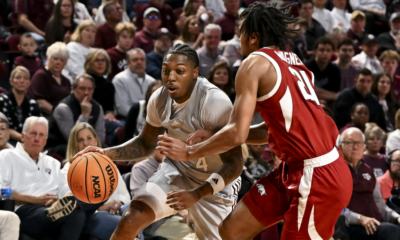 Feb 15, 2025; College Station, Texas, USA; Texas A&M Aggies guard Wade Taylor IV (4) drives as Arkansas Razorbacks guard D.J. Wagner (21) defends during the...
