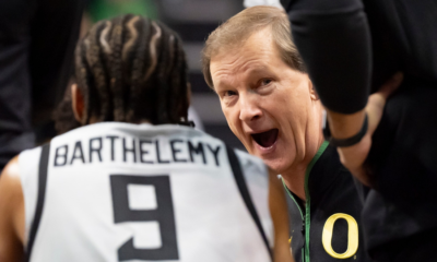 Oregon head coach Dana Altman talks to his team during a timeout as the Oregon Ducks host the Northwestern Wildcats Tuesday, Feb. 11, 2025, at Matthew...