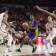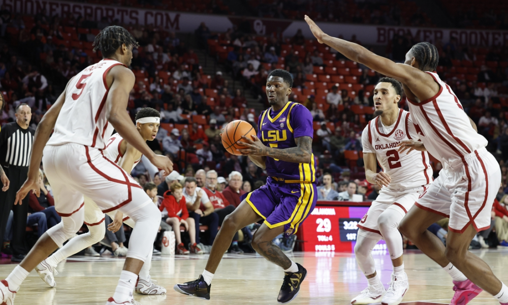 Feb 15, 2025; Norman, Oklahoma, USA; LSU Tigers guard Cam Carter (5) drives to the basket against the Oklahoma Sooners during the first half at Lloyd...