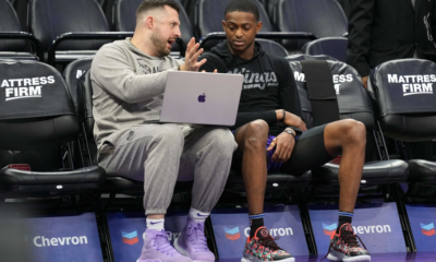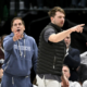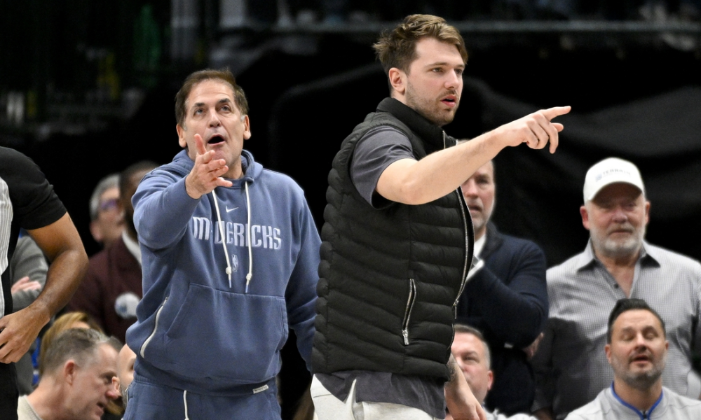 Jan 15, 2024; Dallas, Texas, USA; Dallas Mavericks guard Luka Doncic (right) and Mark Cuban (left) argue a call during the second half of the game...