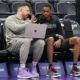 Mar 31, 2024; Sacramento, California, USA; Sacramento Kings assistant coach Luke Loucks (left) talks with guard De’Aaron Fox (right) before the game against the Utah Jazz...