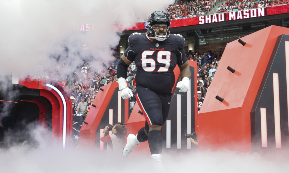 Dec 15, 2024; Houston Texans guard Shaq Mason (69) runs onto the field before the game against the Miami Dolphins at NRG Stadium. Mandatory Credit: Troy...
