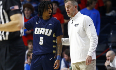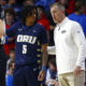 Nov 21, 2024; Oxford, Mississippi, USA; Oral Roberts Golden Eagles head coach Russell Springmann (right) talks with guard Darius Robinson Jr. (5) during the first half...
