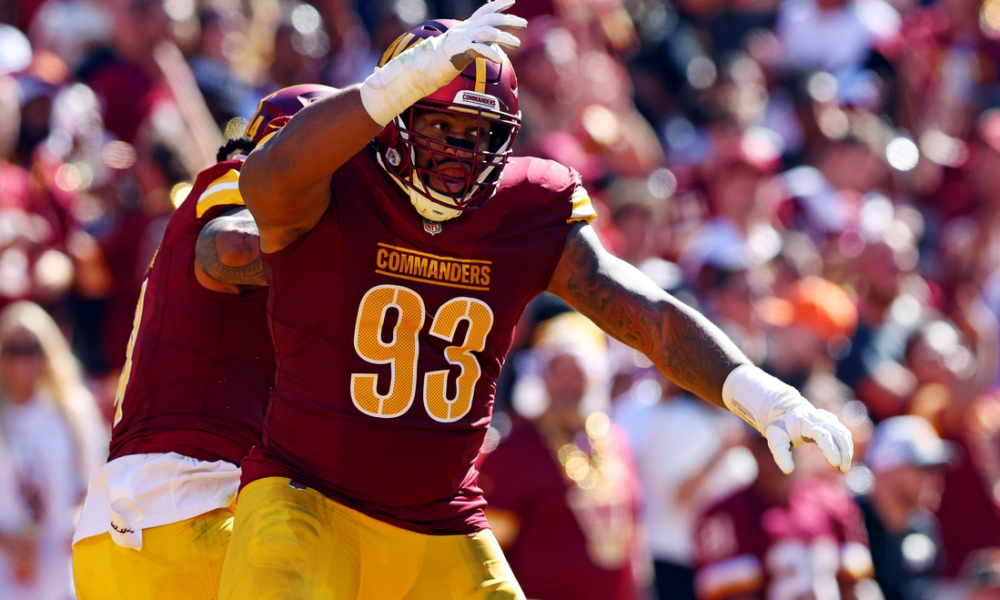 Oct 6, 2024; Landover, Maryland, USA; Washington Commanders defensive tackle Jonathan Allen (93) celebrates after a tackle during the second quarter against the Cleveland Browns at...