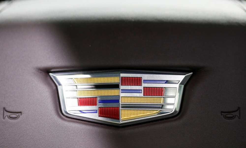 Cadillac logo on the steering wheel of a 2023 Cadillac Escalade-V during the 2023 North American International Auto Show held at Huntington Place in downtown Detroit...