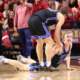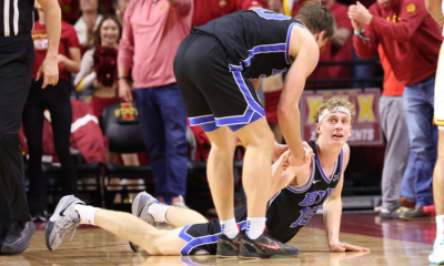 Mar 4, 2025; Ames, Iowa, USA; Brigham Young Cougars guard Dallin Hall (30) helps Brigham Young Cougars forward Richie Saunders (15) off the floor in their...