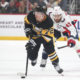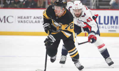Feb 22, 2025; Pittsburgh, Pennsylvania, USA; Pittsburgh Penguins left wing Anthony Beauvillier (72) moves the puck up the ice ahead of Washington Capitals right wing Tom...