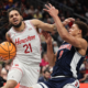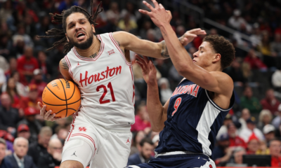 Mar 15, 2025; Kansas City, MO, USA; Houston Cougars guard Emanuel Sharp (21) goes to the basket against Arizona Wildcats forward Carter Bryant (9) during the...