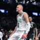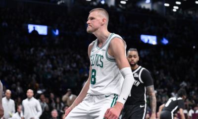 Mar 15, 2025; Brooklyn, New York, USA; Boston Celtics center Kristaps Porzingis (8) reacts after dunking the ball against the Brooklyn Nets during the second half...