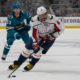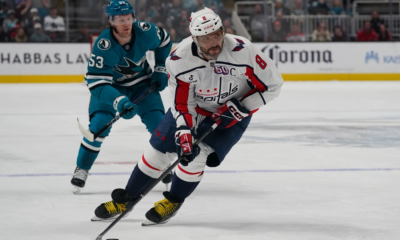 Mar 15, 2025; San Jose, California, USA; Washington Capitals left wing Alex Ovechkin (8) skates past San Jose Sharks center Ty Dellandrea (53) during the first...