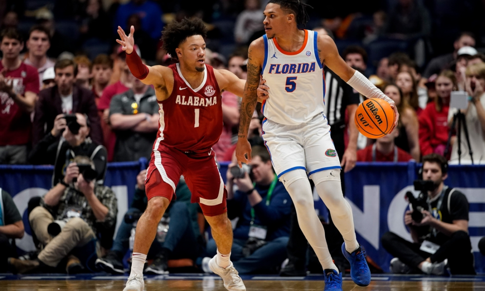 Alabama guard Mark Sears (1) guards Florida guard Will Richard (5) during the first half of a Southeastern Conference tournament semifinal game at Bridgestone Arena in...