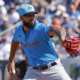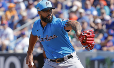 Feb 23, 2025; Port St. Lucie, Florida, USA; Miami Marlins pitcher Sandy Alcantara (22) throws during the first inning against the New York Mets at Clover...