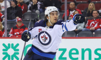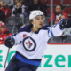 Mar 7, 2025; Newark, New Jersey, USA; Winnipeg Jets left wing Brandon Tanev (73) celebrates a goal by Winnipeg Jets left wing Alex Iafallo (9) (not...