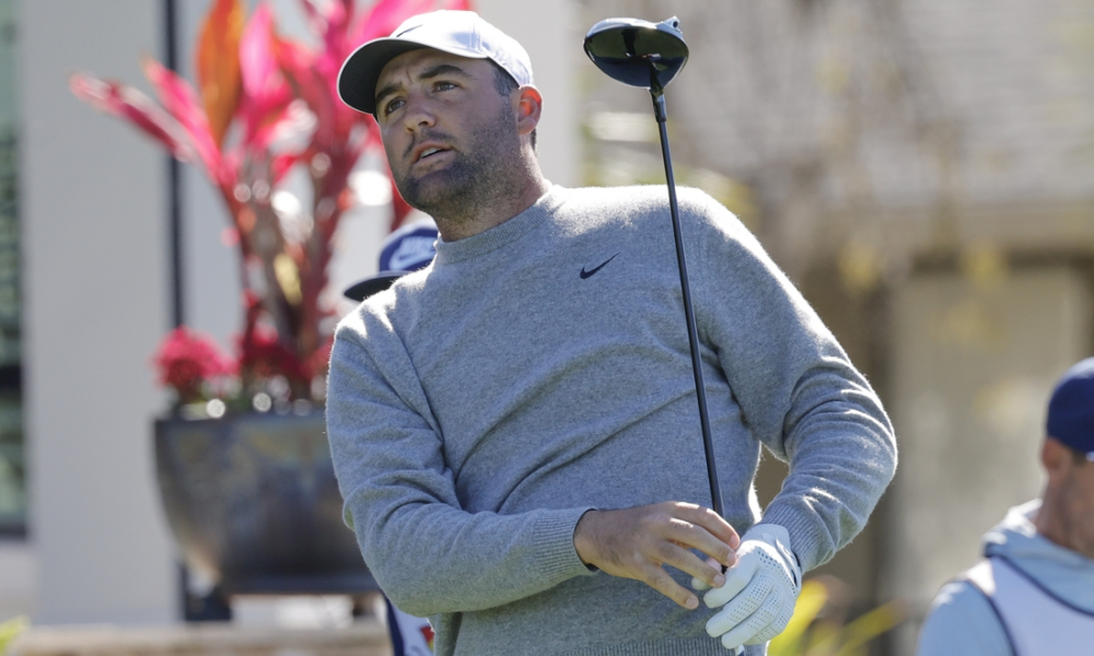 Mar 6, 2025; Orlando, Florida, USA; Scottie Scheffler plays his shot from the fourth tee during the first round of the Arnold Palmer Invitational golf tournament...