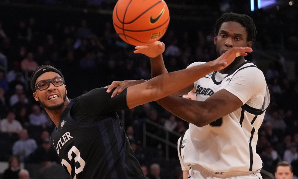 Mar 12, 2025; New York, NY, USA; Butler Bulldogs center Andre Screen (23) fights for the ball with Providence Friars forward Oswin Erhunmwunse (55) during the...