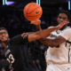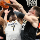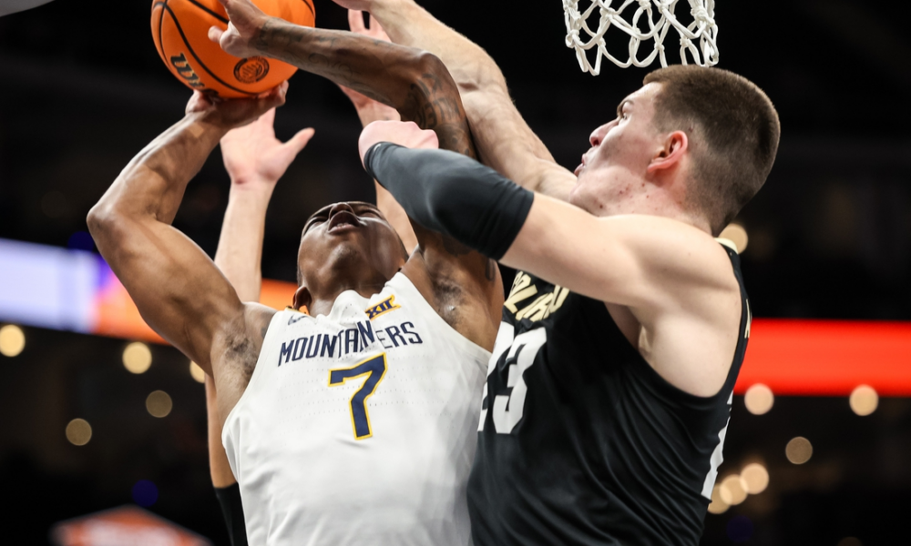 Mar 12, 2025; Kansas City, MO, USA; West Virginia Mountaineers guard Javon Small (7) and Colorado Buffaloes forward Andrej Jakimovski (23) collide under the basket during...