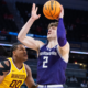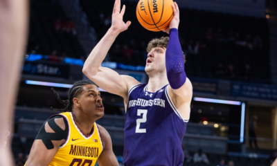 Mar 12, 2025; Indianapolis, IN, USA; Northwestern Wildcats forward Nick Martinelli (2) shoots the ball while Minnesota Golden Gophers forward Frank Mitchell (00) defends in the...