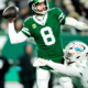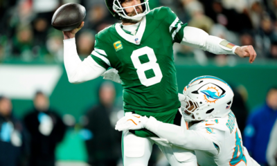 New York Jets quarterback Aaron Rodgers (8) throws a pass before Miami Dolphins linebacker Chop Robinson (44) could take him down, Sunday January 5, 2025, in...
