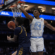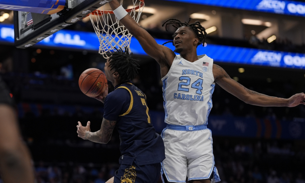 Mar 12, 2025; Charlotte, NC, USA; North Carolina Tar Heels forward Jae’Lyn Withers (24) jumps for the block on the shot by Notre Dame Fighting Irish...