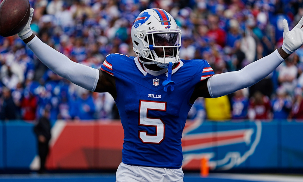 Bills Kaiir Elam celebrates his fumble recovery against Miami during second half action at Highmark Stadium on Nov. 3, 2024. The Dallas Cowboys acquired cornerback Kaiir...