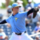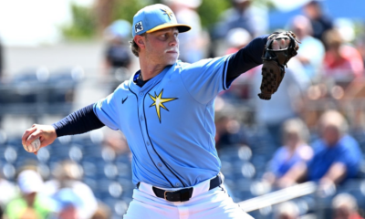Mar 13, 2025; Port Charlotte, Florida, USA; Tampa Bays Rays starting pitcher Shane Baz (11) throws a pitch in the first inning against the Washington Nationals...