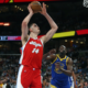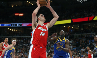 Apr 1, 2025; Memphis, Tennessee, USA; Memphis Grizzlies center Zach Edey (14) shoots as Golden State Warriors forward Draymond Green (23) defends during the first quarter...