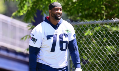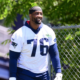 Jun 10, 2024; Foxborough, MA, USA; New England Patriots offensive tackle Calvin Anderson (76) walks to the practice fields for minicamp at Gillette Stadium. Mandatory Credit:...
