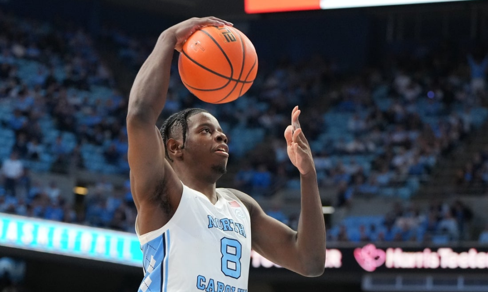 Jan 21, 2026; Chapel Hill, North Carolina, USA; North Carolina Tar Heels forward Caleb Wilson (8) with the ball in the second half at Dean E....