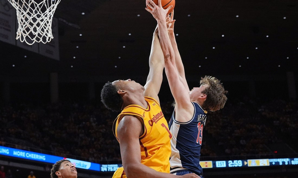 Iowa State Cyclones center Dishon Jackson (1) and Arizona Wildcats forward Henri Veesaar (13) battle for a rebound during the first half in the Big-12 men’s...