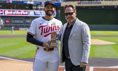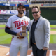 Sep 15, 2024; Minneapolis, Minnesota, USA; Minnesota Twins pitcher Pablo López (49) poses for a photo with Minnesota Twins executive President of Baseball Operations Derek Falvey...